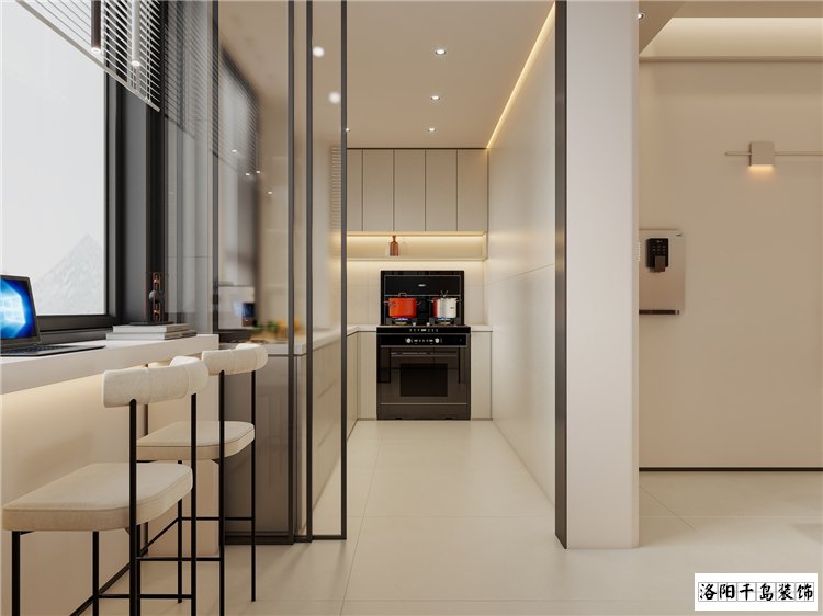 廚房洗切炒依次排開,采用集成灶,頂部的位置也做了吊柜,增加廚房收納,三聯動的極窄邊框推拉門,連著這餐廳的吧臺,功能性非常強大!