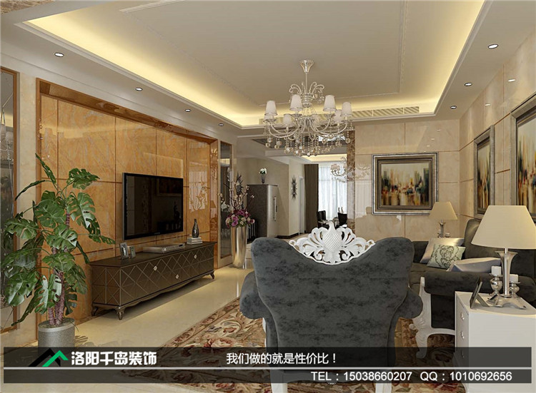 歐式的電視背景墻,選用亮面石材,將大理石被劃分成長方形塊,光滑的質(zhì)地將墻面襯托得優(yōu)雅奢華。