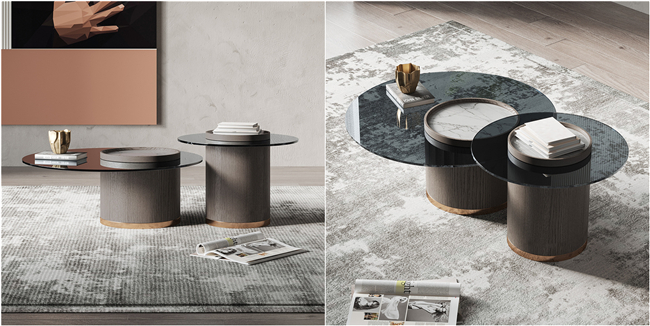 這套意式圓形茶幾打破傳統茶幾的形式,高低款式可以隨意組合,給人一種錯落有致的美。茶幾最吸引我的部分就是桌面的設計,兩種不同的材質結合,給人一種獨特的美。