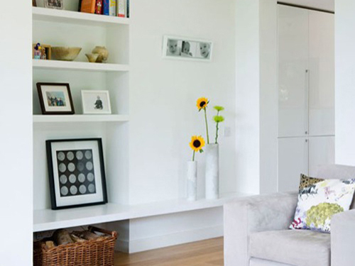 不得不說,室內的凹處用來作收納,是一個好的選擇,不管上面能放,和地板隔開的地方都同樣能放,在上層的顯眼位置就用來放些裝飾品,讓凹陷的空間也散發出一絲藝術的光芒。